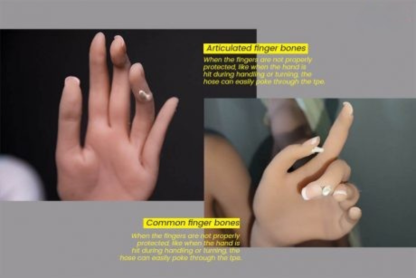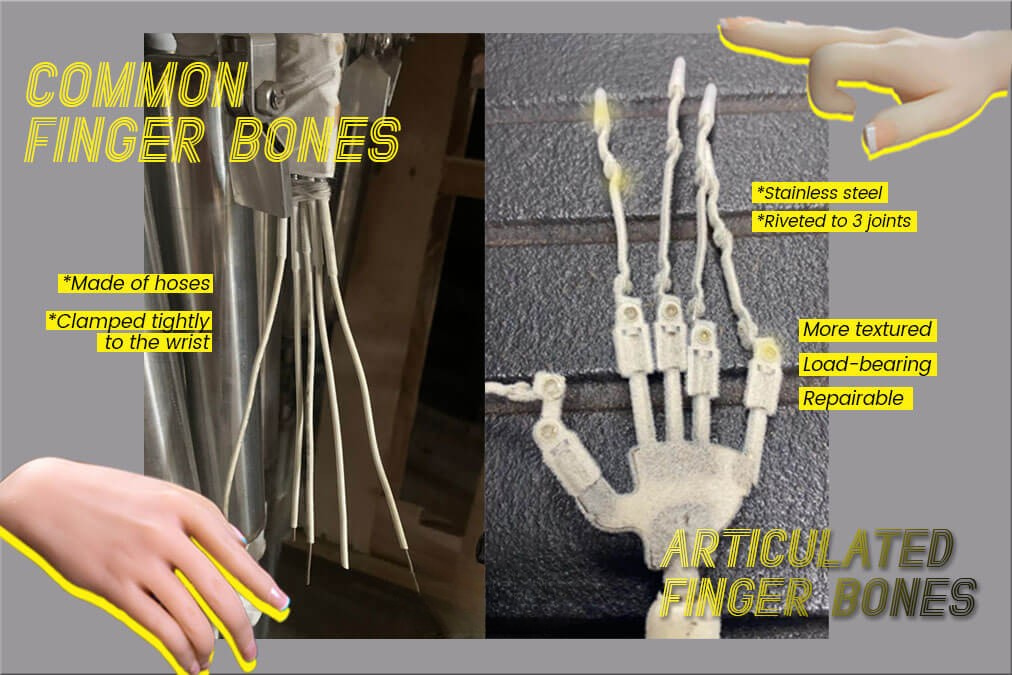 Les os articulés des doigts (disponibles pour SEDOLL 150 cm+) sont fabriqués en acier inoxydable et rivetés aux trois articulations de chaque doigt, de la base du doigt à la paume. Le revêtement de surface a pour but d’augmenter l’adhérence du matériau TPE aux os des doigts, tandis que la couleur proche du teint de la peau empêche les os de déteindre. Les os articulés des doigts améliorés font l’objet d’améliorations et d’optimisations constantes. La version originale, dans laquelle la paume était constituée d’une grande pièce en acier inoxydable, a été simplifiée pour devenir une fine bande, ce qui réduit quelque peu son poids tout en obtenant le même effet.